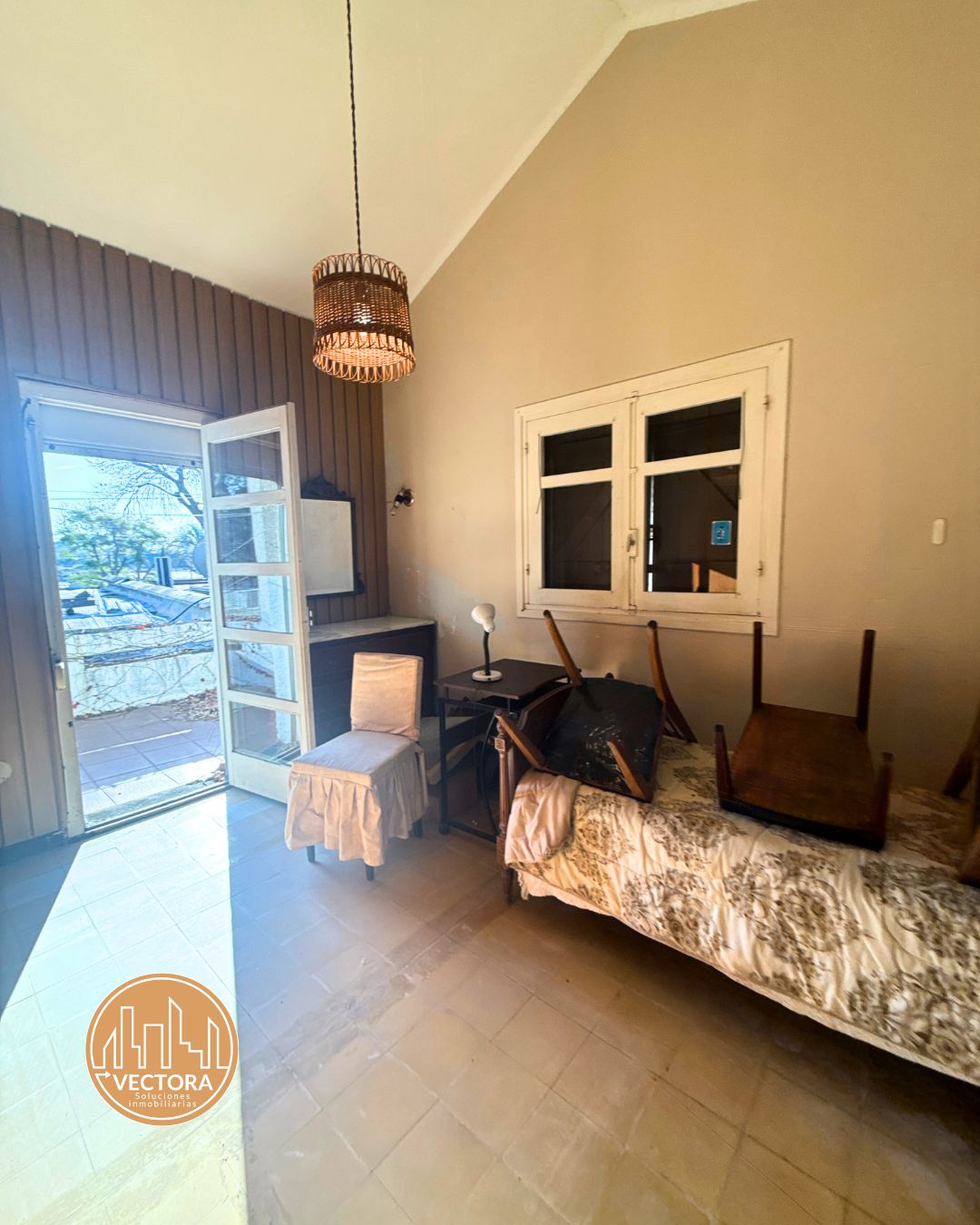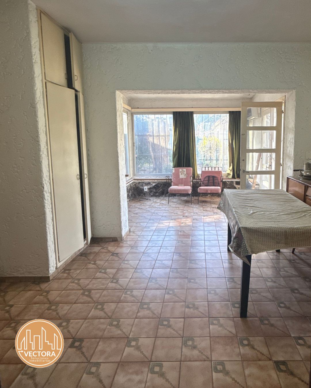 ✅ Amplio salón con estufa a leña, ventanales y salida al fondo