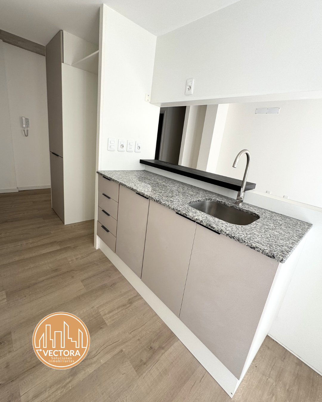 💠 Cocina definida abierta: con mesada de granito y muebles bajo mesada. Mueble para calefón y lavarropas